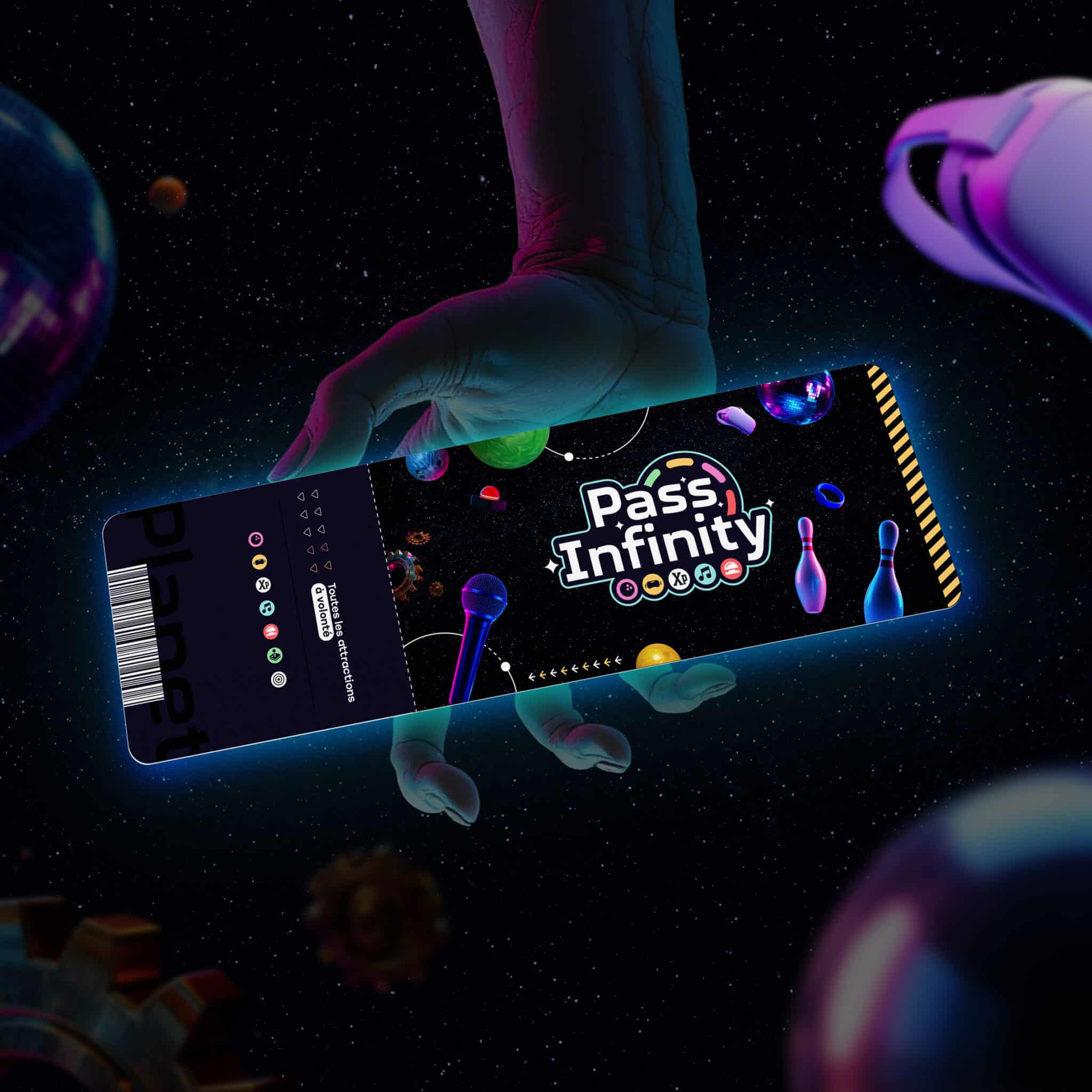 Pour prolonger l’expérience client, nous avons développé un univers visuel immersif basé sur la thématique de l’exploration spatiale et de la science-fiction. Cette identité repose sur la mise en scène de personnages et d’objets en apesanteur, déclinés sur l’ensemble des supports de communication pour renforcer la cohérence avec le nom de l’enseigne. Ce paysage graphique plonge le visiteur dans un moment suspendu, hors du temps, où chaque activité est représentée par des visuels clés mettant en scène des protagonistes en lévitation entourés d’éléments emblématiques de leurs loisirs.